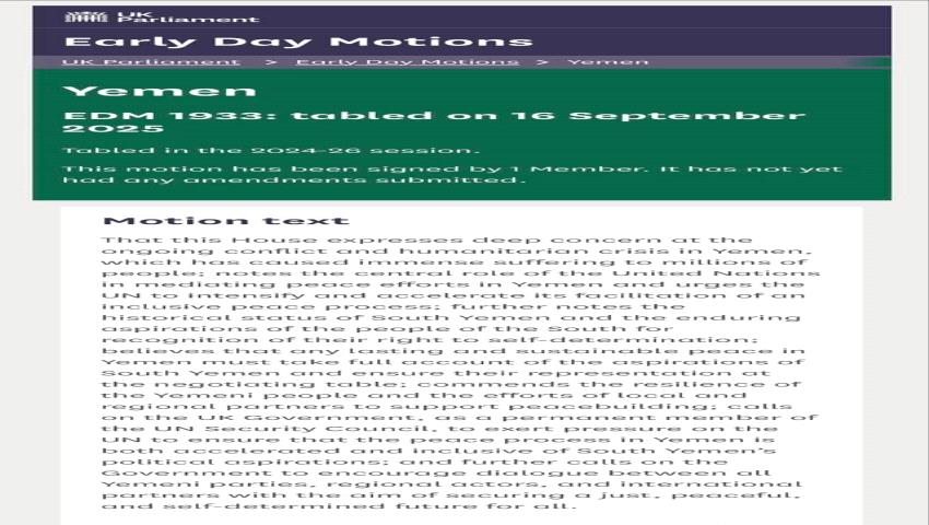 ويُنظر إلى هذه الخطوة على أنها تطور بارز في موقف البرلمان البريطاني تجاه القضية الجنوبية، وتمهيد لمناقشات أوسع داخل أروقة البرلمان حول سبل دعم السلام الشامل في اليمن وضمان تمثيل الجنوب في أي مفاوضات قادمة.