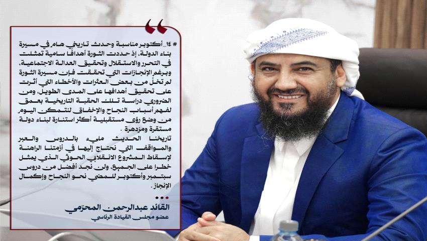 وفي منشور له على صفحته الرسمية على مواقع التواصل الاجتماعي، بمناسبة الذكرى الـ62 لثورة الـ14 من أكتوبر المجيدة، أشار القائد المحرّمي إلى أنه "برغم الإنجازات التي تحققت فإن مسيرة الثورة لم تخلُ من بعض العثرات والأخطاء التي أثرت على تحقيق أهدافها على المدى الطويل".