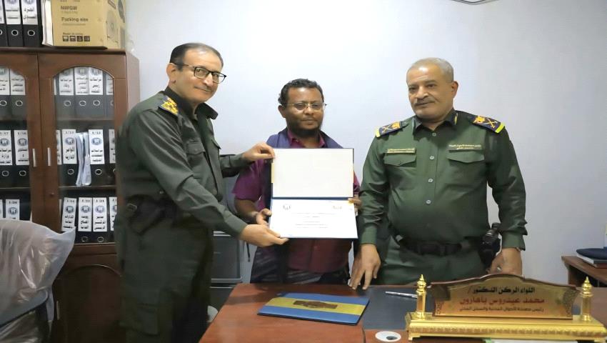 كرمت رئاسة مصلحة الأحوال المدنية والسجل المدني، ممثلة برئيس المصلحة اللواء الدكتور محمد باهارون ووكيل المصلحة العميد محسن العمري، قائد نقطة مصنع الحديد التابعة لحزام طوق عدن المقدم شكري عبدالعزيز، وذلك تقديراً لجهوده الأمنية المتميزة في ضبط وثائق ثبوتية غير شرعية كانت في طريقها من مناطق سيطرة مليشيات الحوثي إلى العاصمة عدن.